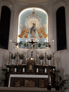Al centro è l’altare “versus populum” con un paliotto marmoreo con l’altorilievo dell’ Agnello mistico. Accanto all’ambone, ripristinata nel mese di Settembre 2019, è la grata metallica con la riproduzione di una pagina di corale che permette alle monache benedettine dell’annesso Monastero di San Paolino da Nola di partecipare alle Celebrazioni liturgiche.